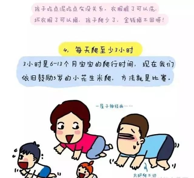 總結(jié):爬行是一項長期的任務(wù),需要堅持,即使是冬天氣溫過低時,家長應(yīng)該在家里辟出一塊寶寶爬行“自留地”,幫助寶寶爬行。